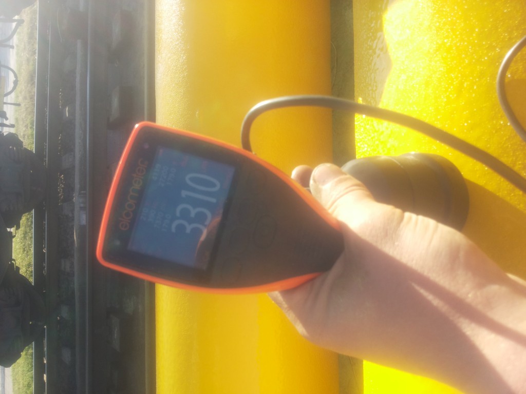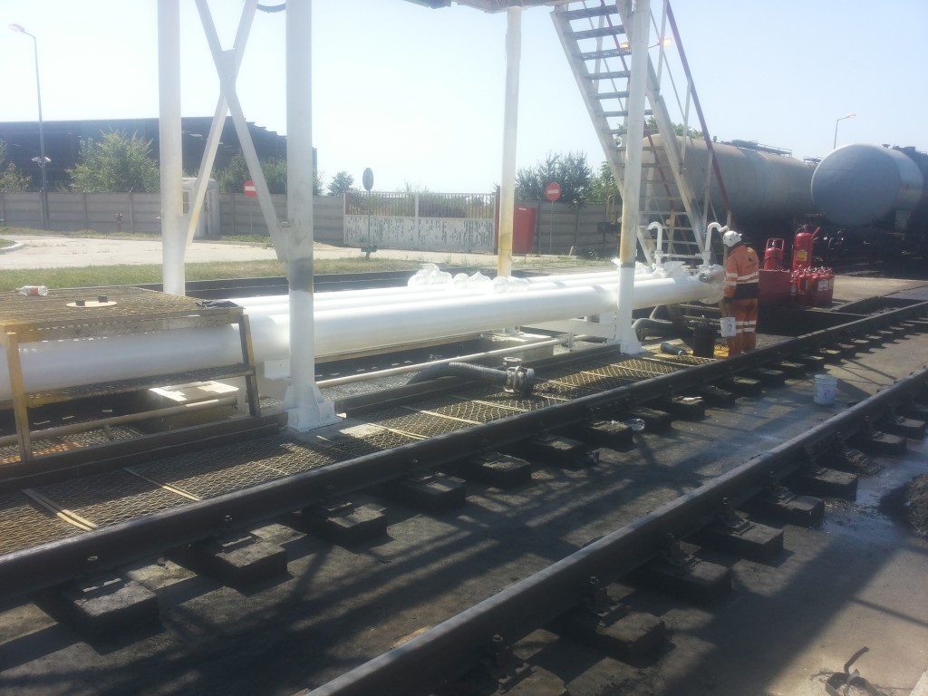 Solutia aleasa a fost reprezentata de degresare, indepartarea vopselei vechi cu ajutorul sablarii uscate, aplicarea unui grund epoxidic, a unui invelis elastomeric intermediar de 2 mm si a unui strat final din poliuretan pentru protectie UV.