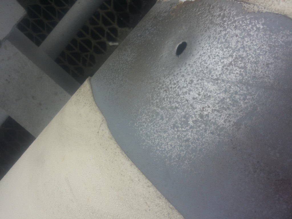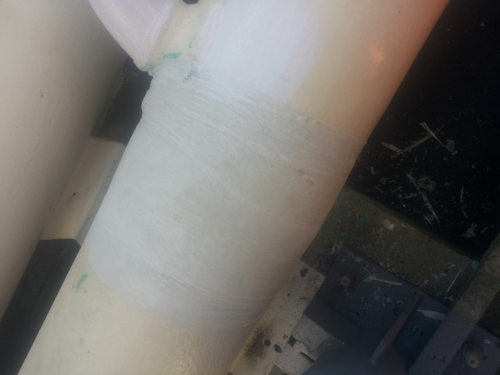 In timpul procesului de sablare si de curatare am identificat un orificiu de 5 mm intr-una dintre conducte. Orificiul fusese generat de coroziune si determina pierderi ale produsului. Din cauza atmosferei cu potential exploziv sudura era imposibil de realizat, astfel incat au fost folosite produse si tehnici neconventionale de reparatie.